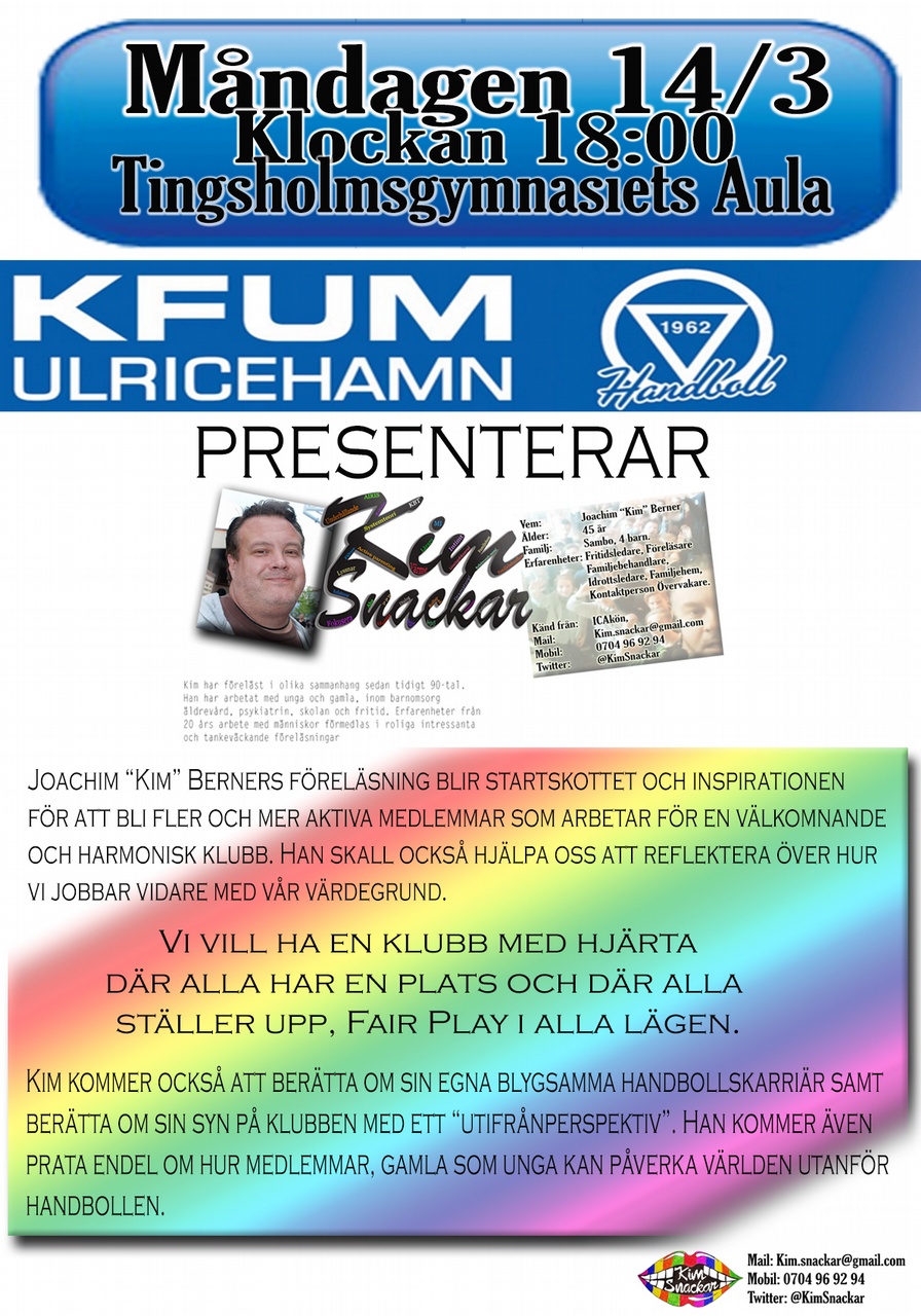Kim kommer också att berätta om sin egna (blygsamma) handbollskarriär samt berätta om sin syn på vår klubb från ett "utifrånperspektiv". Han kommer även att prata en del om hur medlemmar, gamla som unga kan påverka världen utanför handbollen.